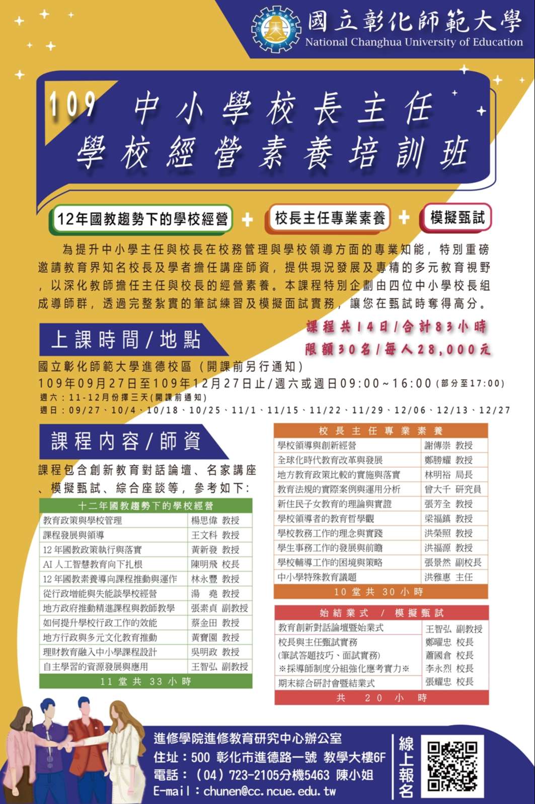 轉知國立彰化師範大學進修學院推廣教育109年「中小學校長、主任經營素養培訓班」招生簡章