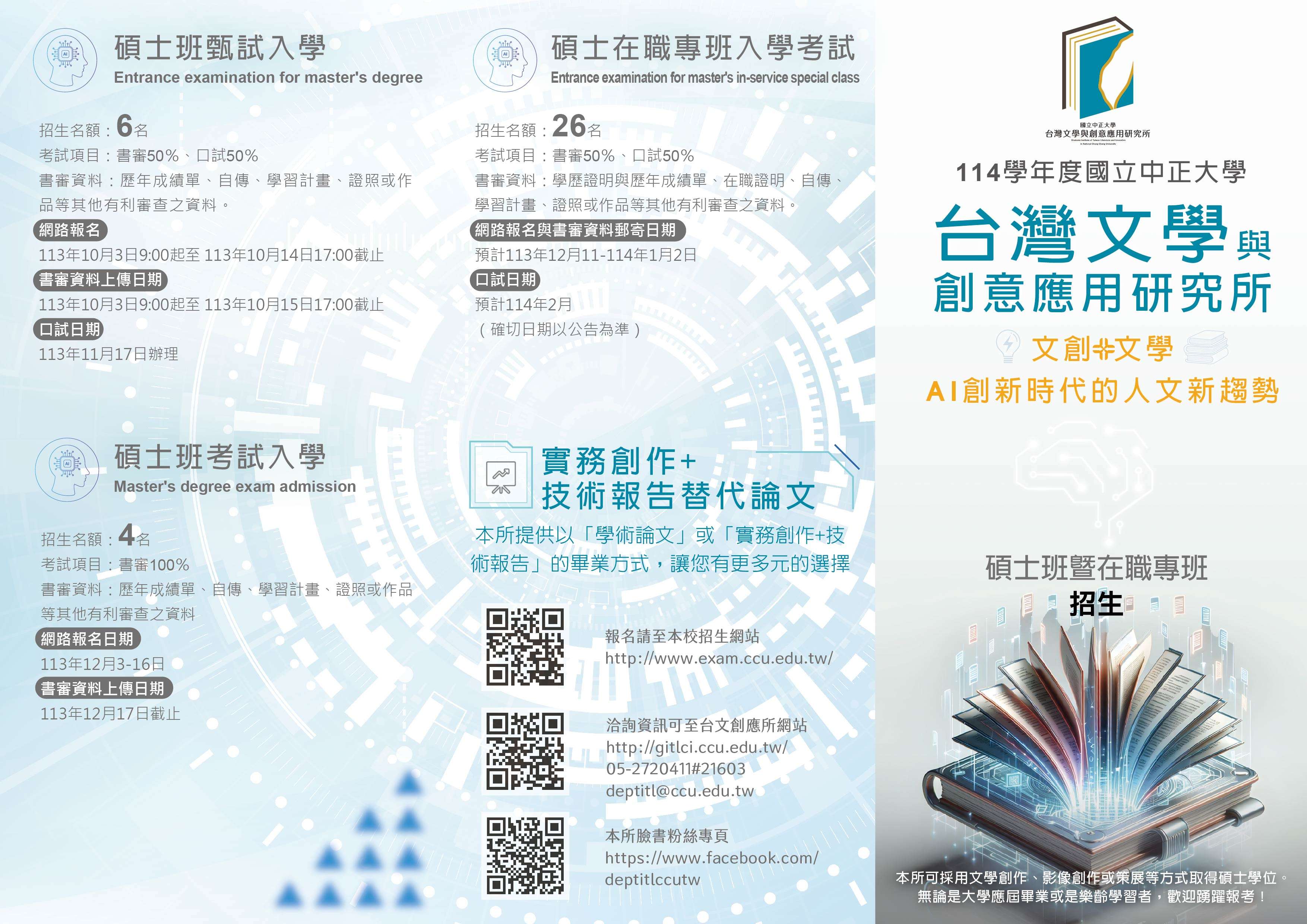 周知國立中正大學台灣文學與創意應用研究所114學年度碩士班甄試入學招生海報及DM