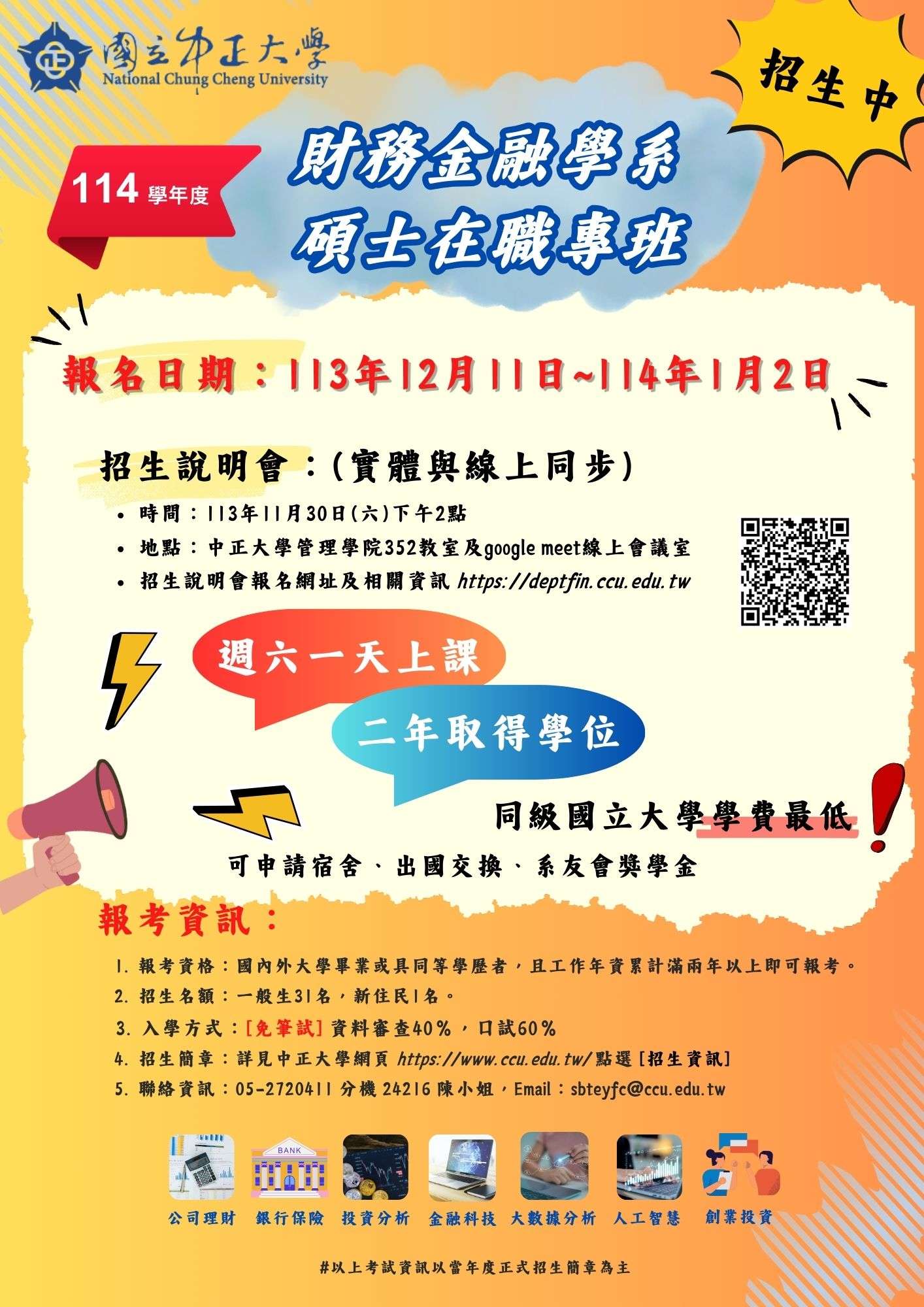 周知國立中正大學財務金融學系碩士在職專班114學年度招生宣傳海報