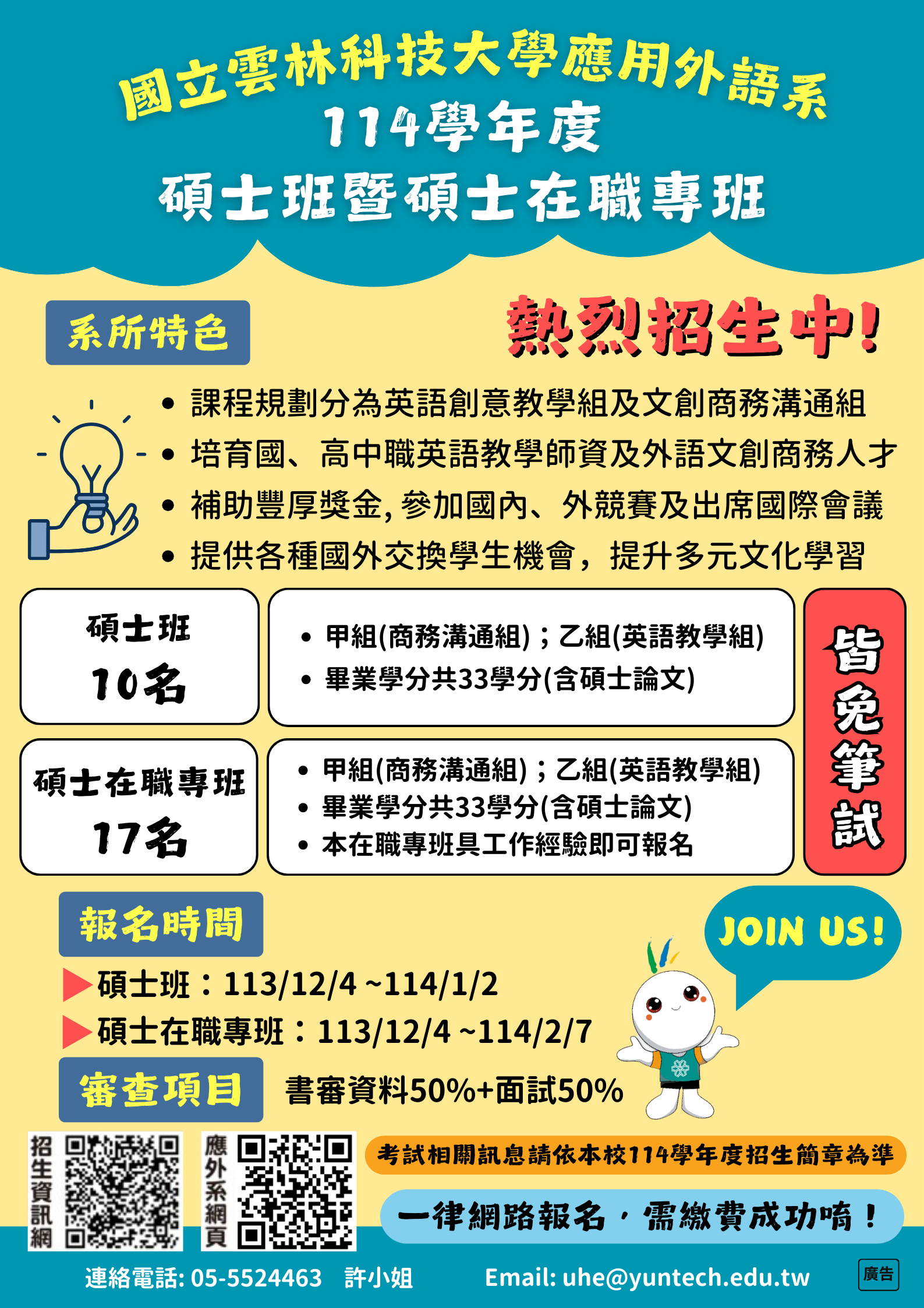 周知雲林科技大學應用外語系114學年度碩士班暨在職專班招生資訊