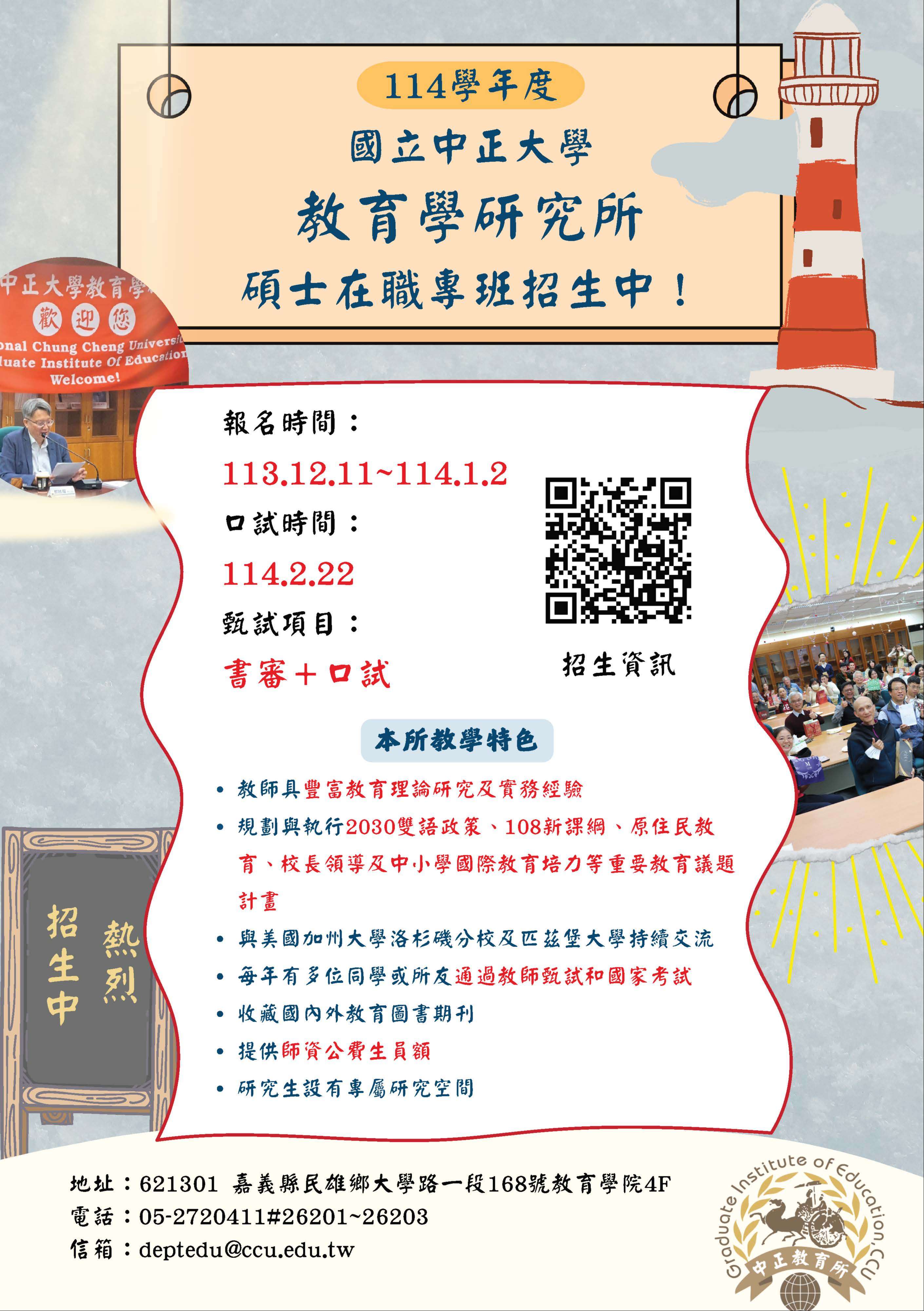 周知114學年度國立中正大學教育學研究所碩士在職專班招生資訊