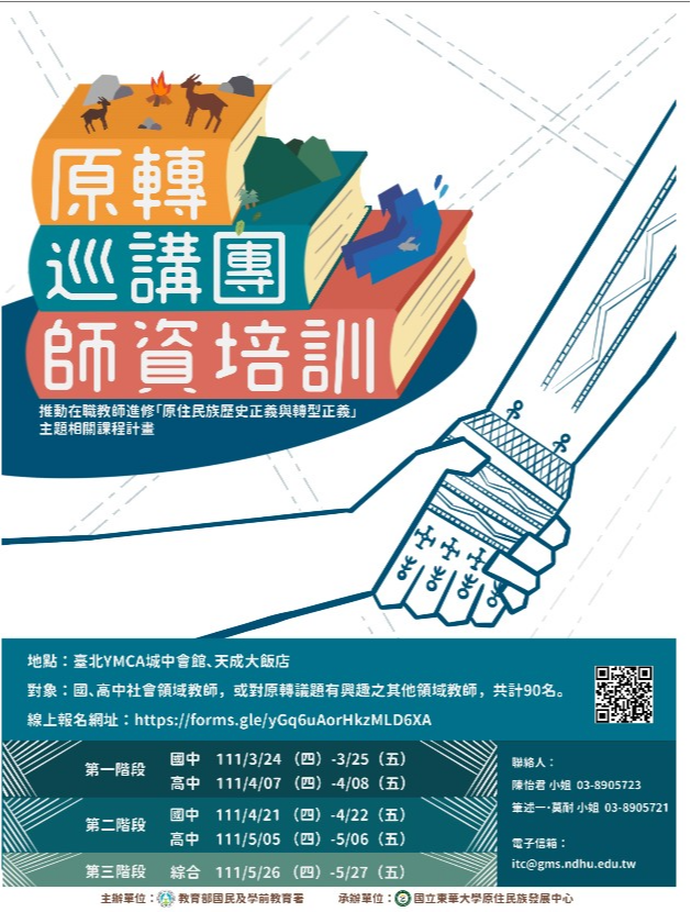 一、該署委託國立東華大學辦理「推動在職教師進修原住民族歷史正義與轉型正義主題相關課程計畫」-原轉巡講團師資培訓計畫,依三階段期程逐序依國中、高中階段辦理原轉師資培訓及教學增能,報名自即日起至111年2月24日 (星期四)止,報名網址如下:https://forms.gle /yGq6uAorHkzMLD6XA。
