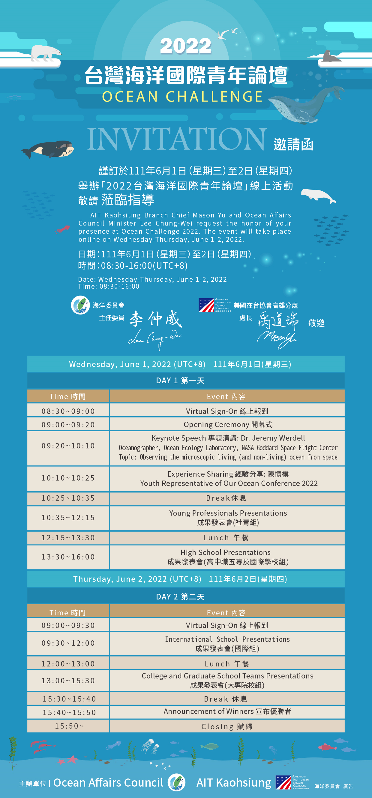 一、為號召更多青年學子及社會青年投入守護海洋的行列,關心海洋議題,並運用海洋科學協助突破海洋危機與困境,同時促進國際交流與互動,海洋委員會特與美國在台協會高雄分處(AIT/K)合作辦理「2022台灣海洋國際青年論 壇」線上活動,以深耕海洋國際教育,促進海洋科學研究發展。