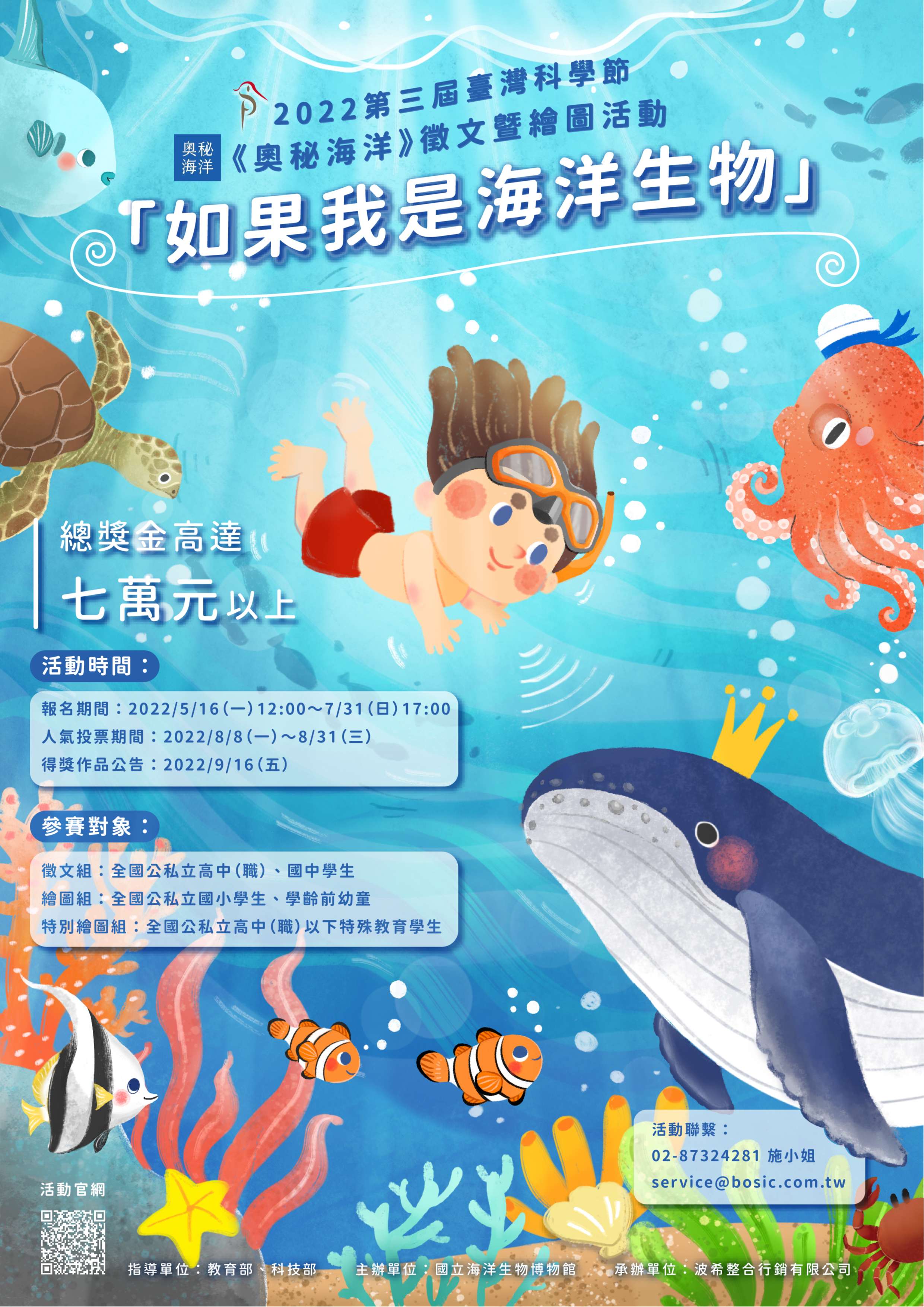 一、為鼓勵學生透過「閱讀」探索海洋及海洋生物的奧秘,並經由文字與繪畫傳達對於海洋的懇切心聲,以培養未來的海洋人才及意見領袖,辦理旨揭活動,請鼓勵學生踴躍投稿參與。