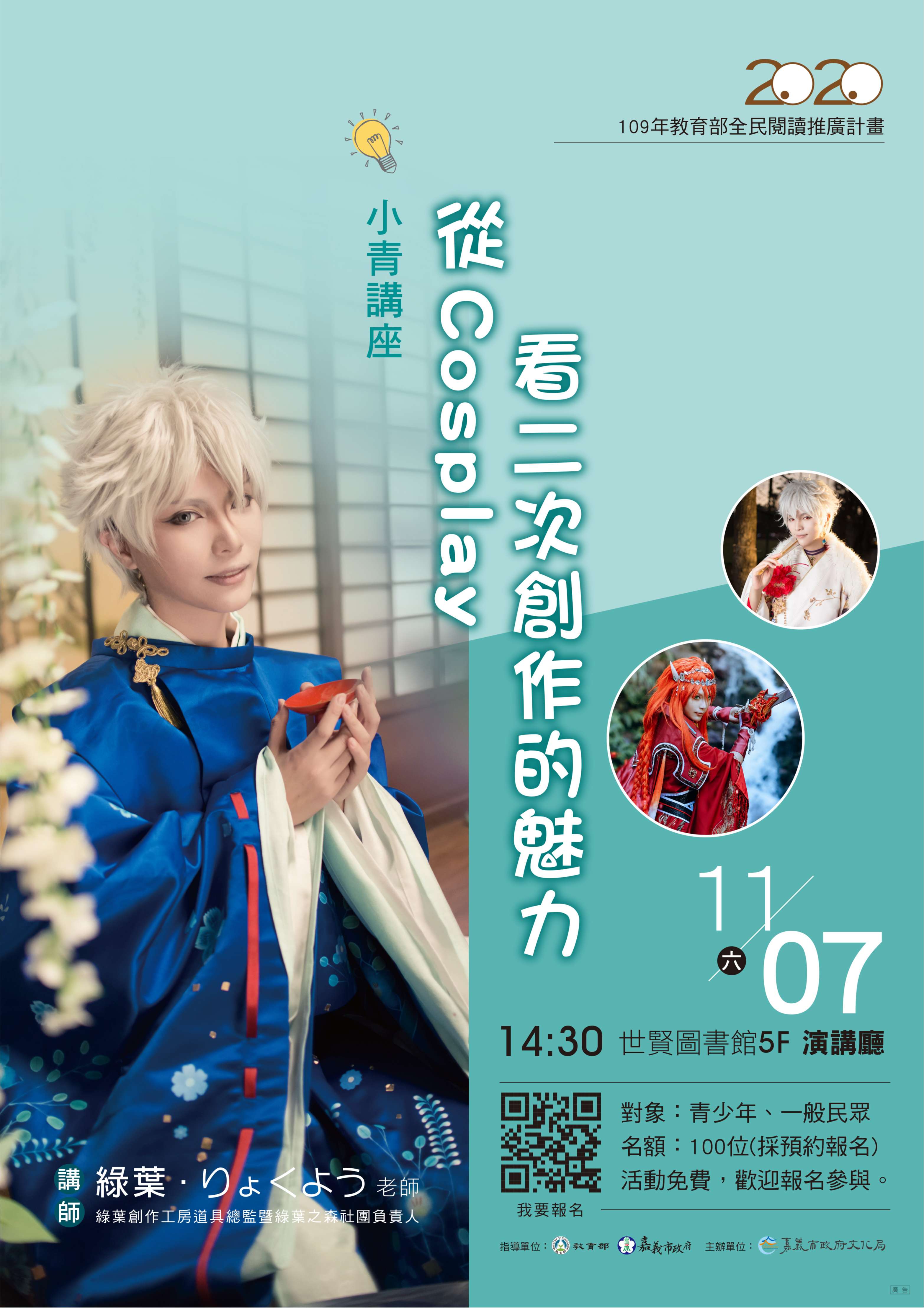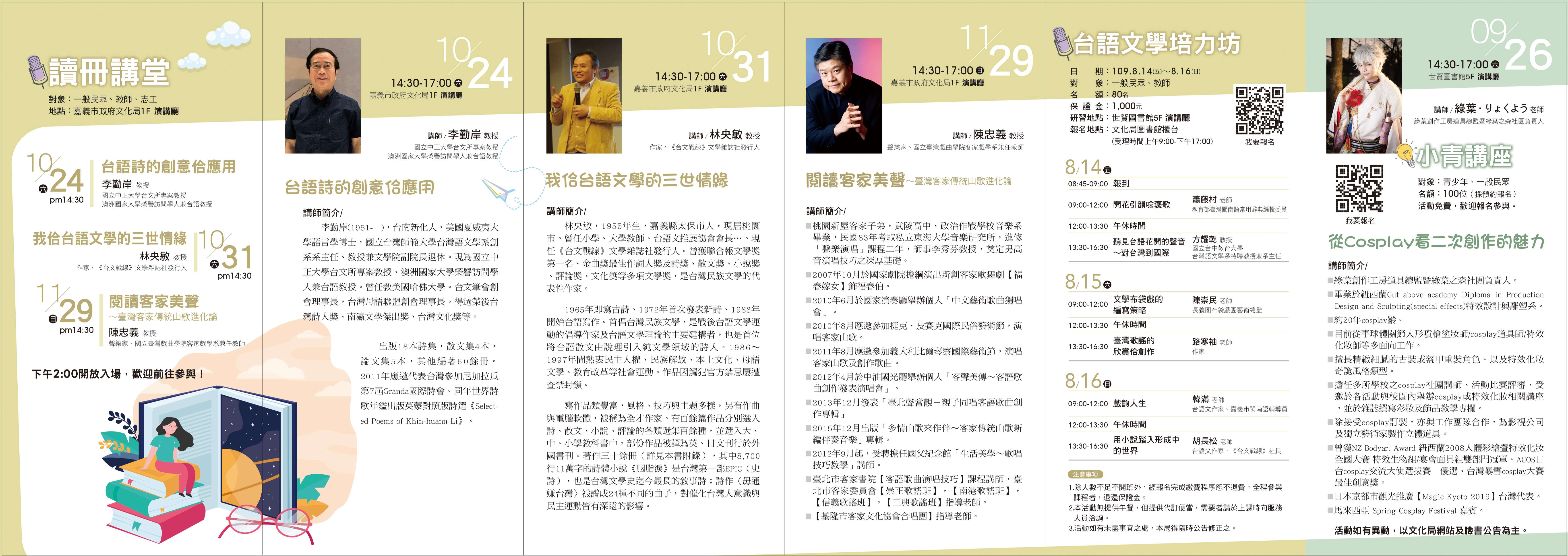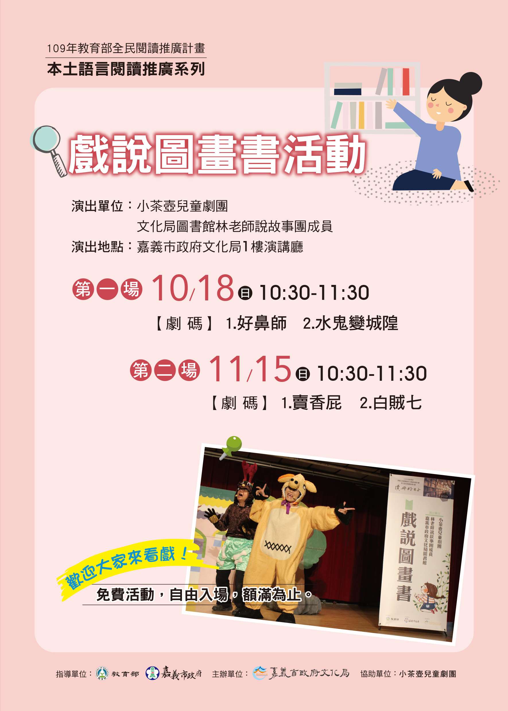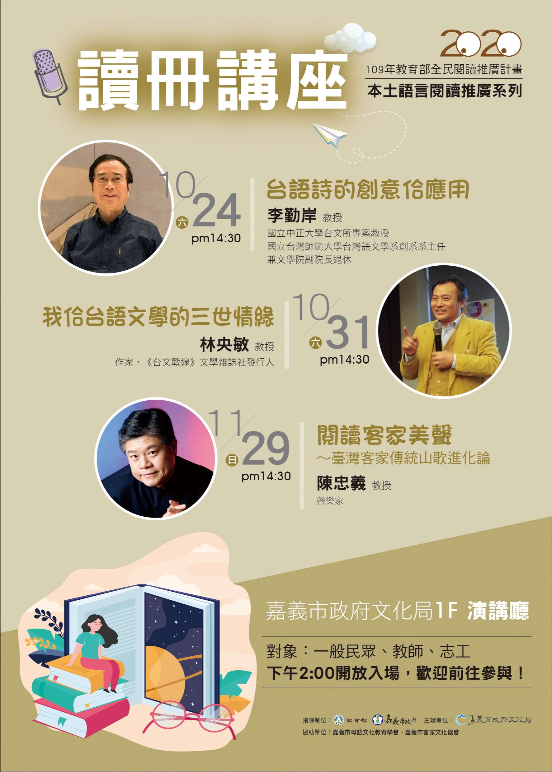 嘉義市文化局109年辦理多元閱讀與本土語言閱讀推廣計畫─ 「小青講座」、「讀冊講堂」及「戲說圖畫書」活動,內容情詳見附件海報。