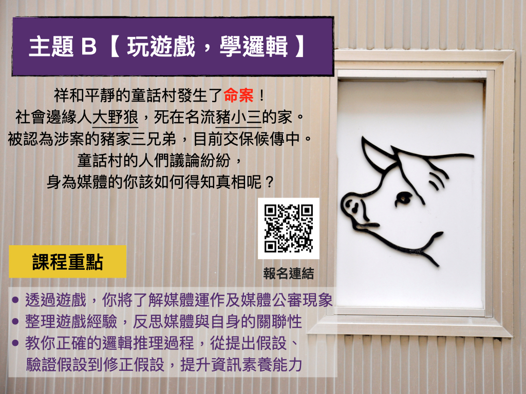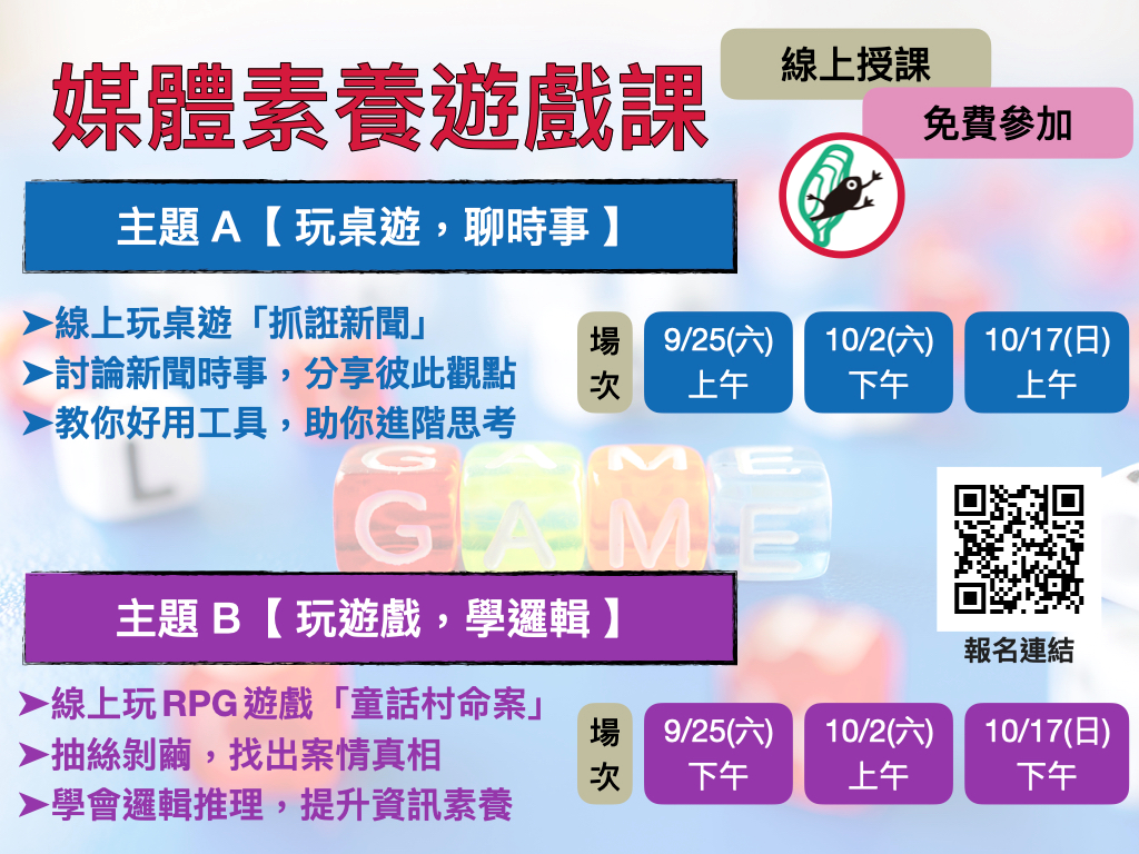 一、工作坊以「自發」、「互動」及「共好」之基本理念,為與社會脈動、生活情境緊密連結,舉辦「媒體素養遊戲課」,以媒體與資訊素養教育培養全民批判思考及解決問題的能力,提升全民面對資訊的責任感,並能追求尊重多元、同理關懷、公平正義與永續發展等核心價值。