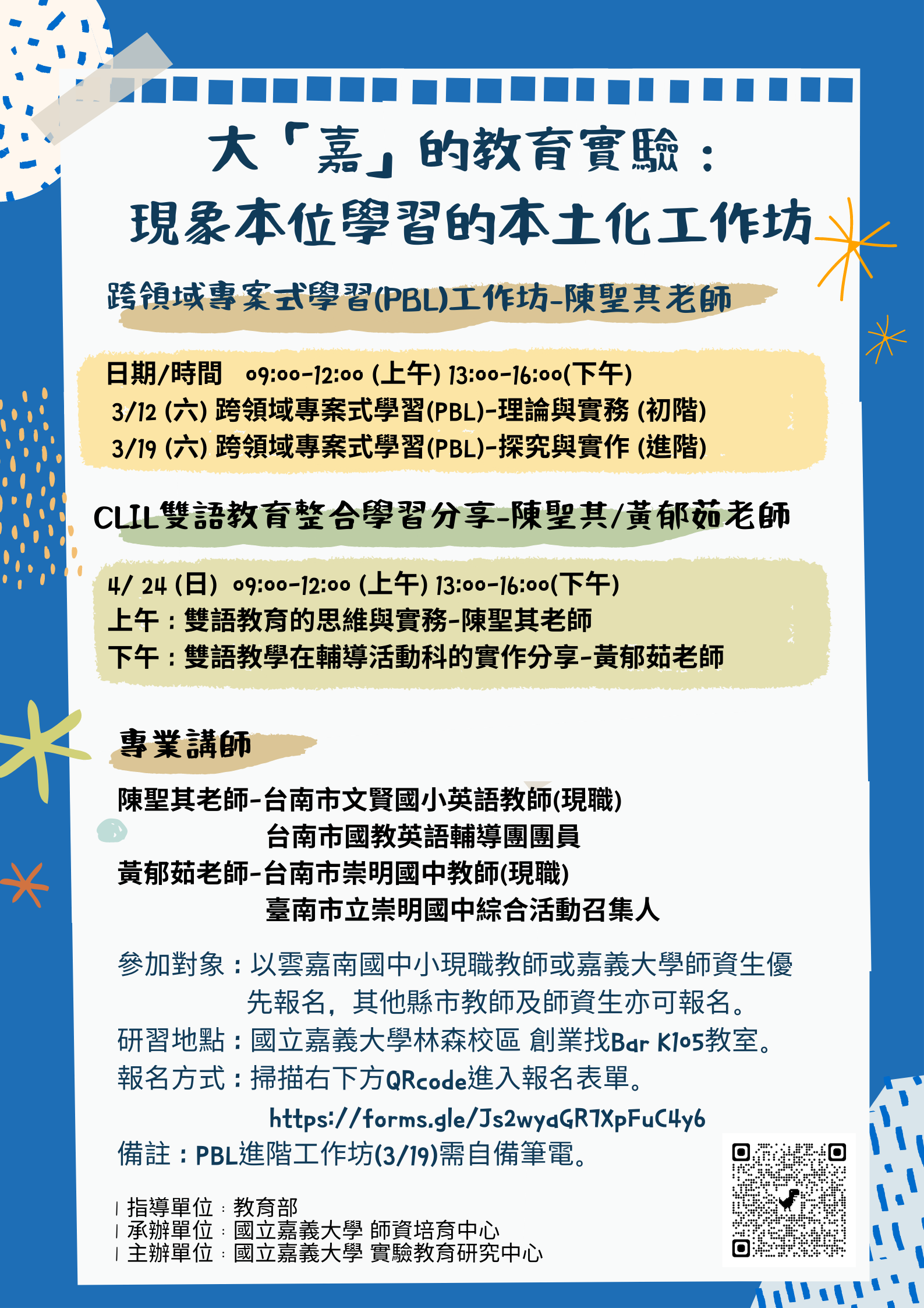 二、參加對象:雲嘉地區各公私立高中職、國中小有興趣之教師,共計40人,額滿為止,報名網址:https://forms.gle /Js2wyaGR7XpFuC4y6。
