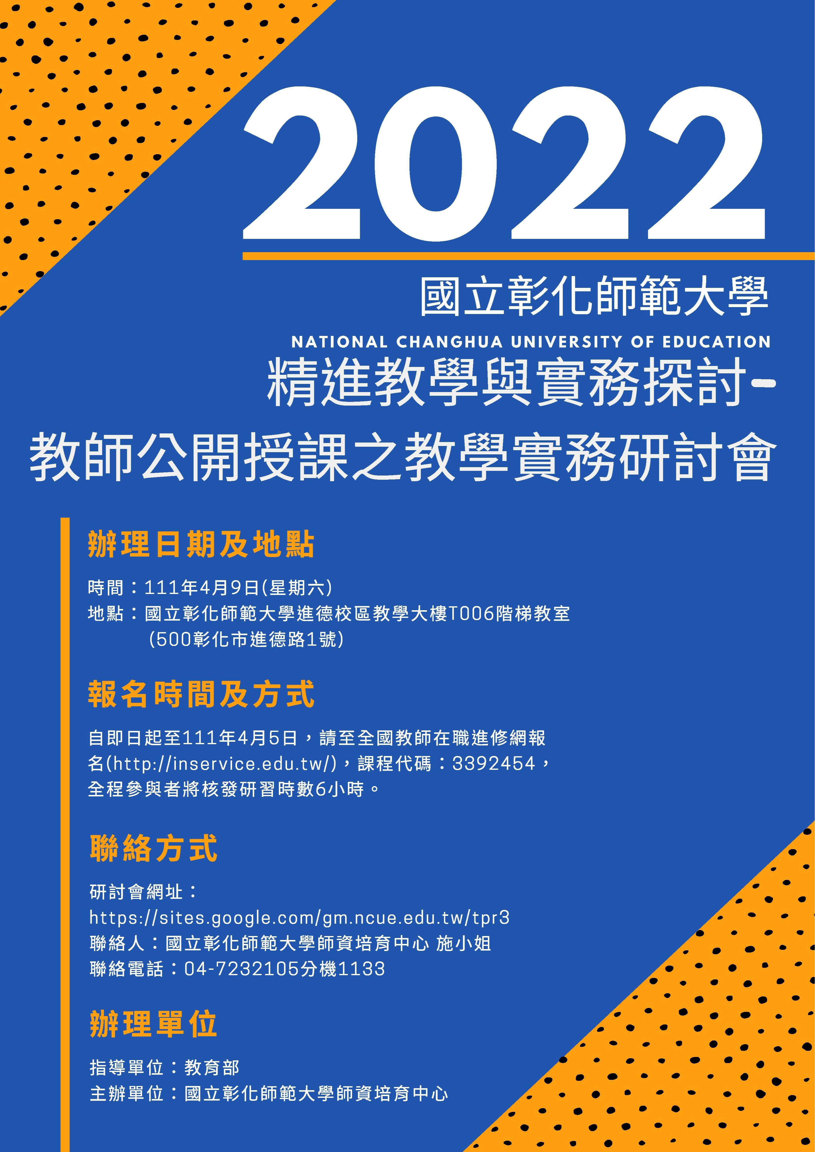 四、本案聯絡人:國立彰化師範大學師資培育中心施助理,電話:04-7232105分機1133;研討會網站:https://sites. google.com/gm.ncue.edu.tw/tpr3 。