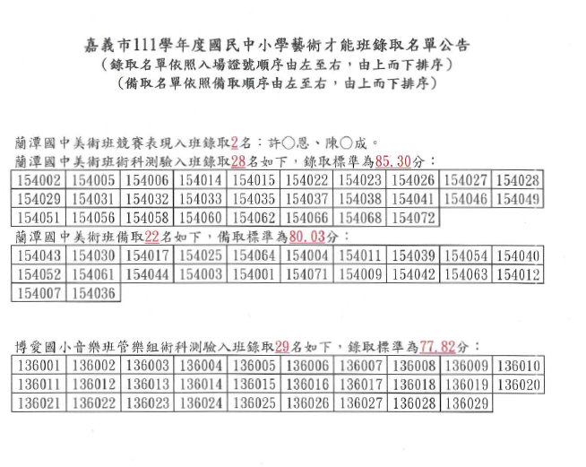 嘉義市111學年度國民中小學藝術才能班錄取名單公告