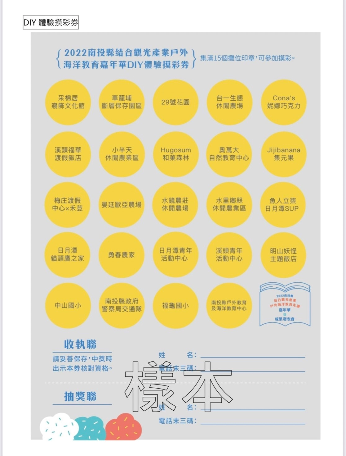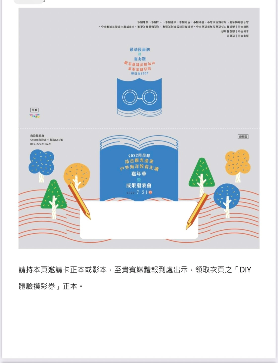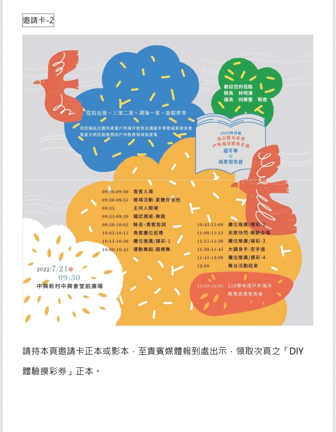 一、為媒合學校戶外海洋教育與觀光特色產業,該府辦理「2022南投縣結合觀光產業戶外海洋教育走讀嘉年華暨成果發表會」,邀請上開產業設攤展示課程,讓學校承辦人員實際體驗洽談,活動資訊如下: