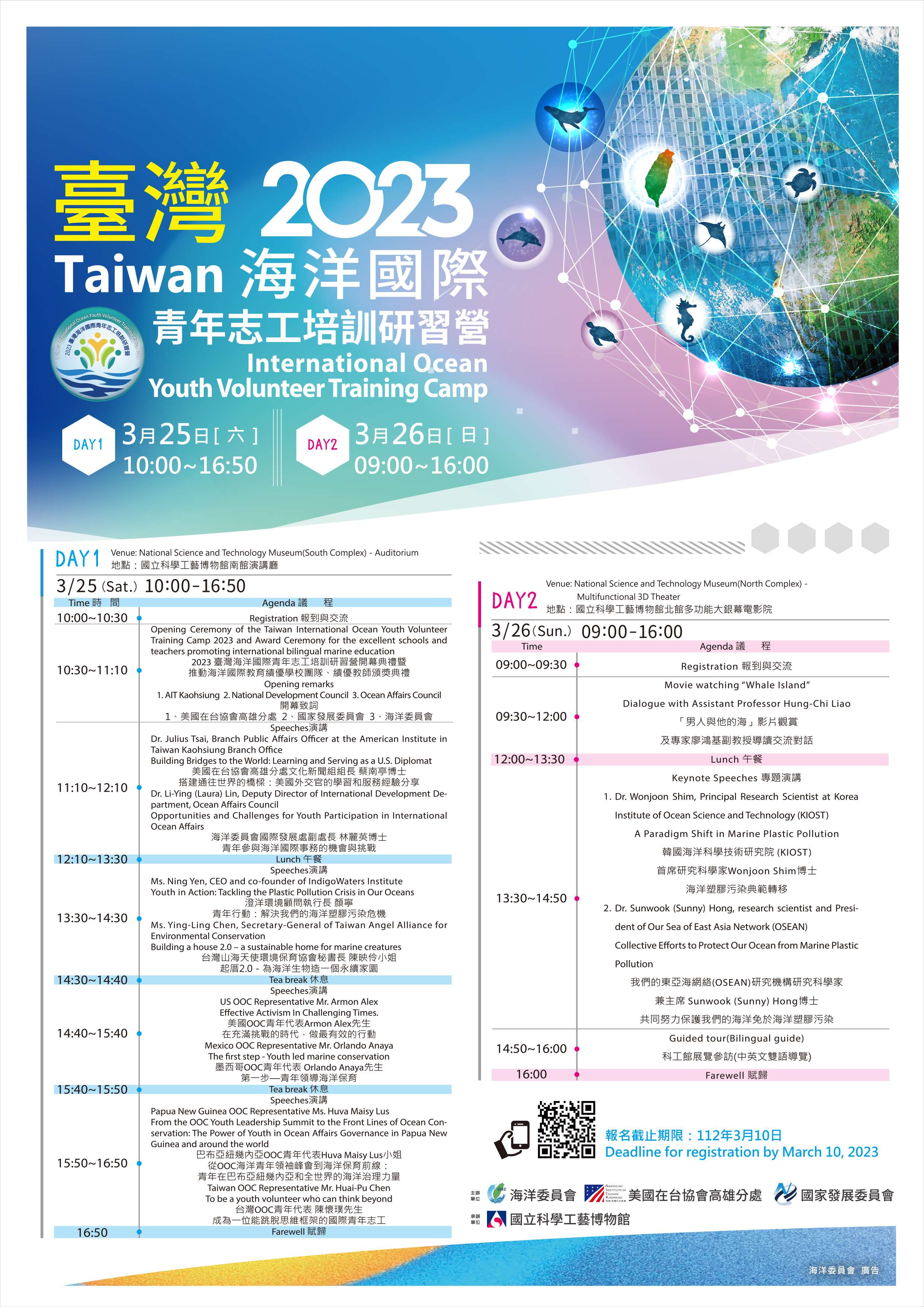 一、該會為推動海洋永續發展,強化國際海洋事務能力,推動 2030雙語政策,加速推動高等教育雙語化,深化臺美雙邊合作夥伴關係,提升全球競爭力,扣合「國家海洋政策白皮書」施政目標,特與國家發展委員會、美國在台協會高雄分處(AIT/K)合作舉辦「2023臺灣海洋國際青年志工培訓研習營」,研習營主題設定為「Heirs to Our Oceans take Action Together. Protect Our Oceans, Our Future! 海洋繼承人們共同採取行動,保護我們的海洋、我們的未來」,並邀請韓國、美國、墨西哥等OOC青年代表,與我國NGO專家等擔任講者,與青年學子交流對話,以激勵更多年輕人一起參與海洋事務,讓更多青年學子主動關心海洋議題,運用創意、活力與熱情,轉化為實際參與行動,協助突破海洋危機與困境,投入參與守護海洋的行列,同時撒下海洋教育的種子,以達成海洋永續發展目標。