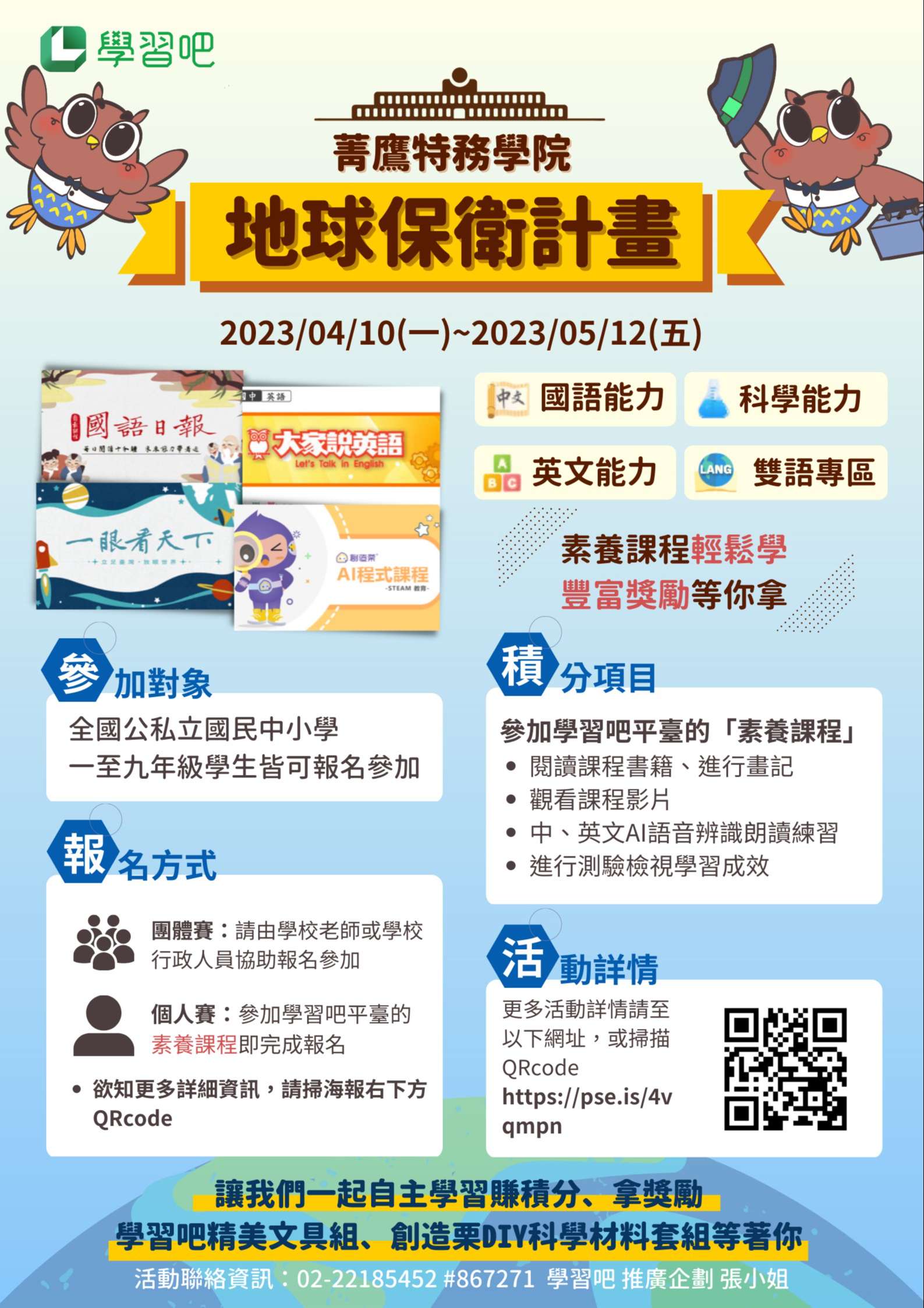 一、參加對象:各公私立國民中小學學生。 二、活動課程邀請碼:985474。