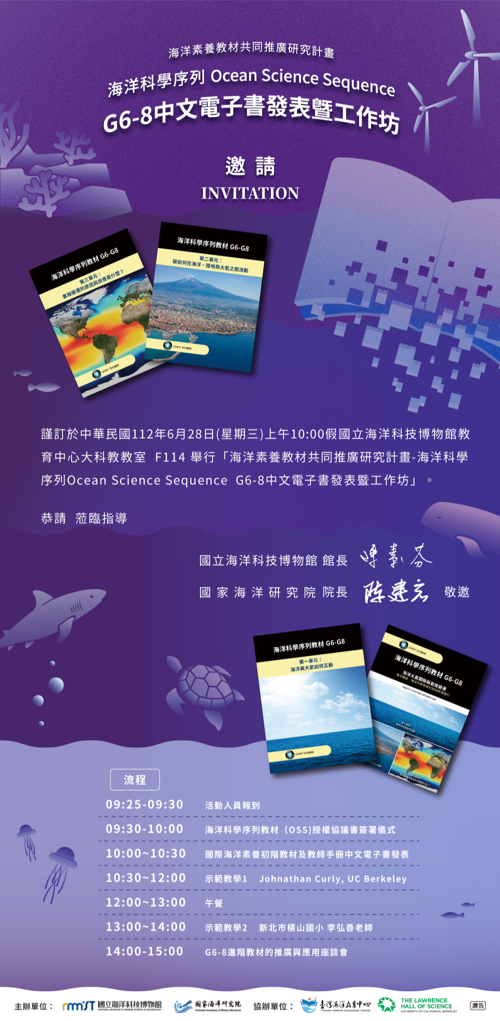 (三)活動內容:進階教材主要內容是以科學探討的方式介紹海洋、大氣與氣候變遷的關聯,同時邀請本教材課程設計者加州大學的Johnathan Curly示範及分享教案,歡迎有興趣的夥伴踴躍報名參加,內容詳見附件簡章。