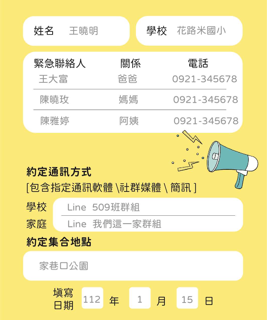 2.請老師讓學生填寫新版家庭防災卡,範例如附件。