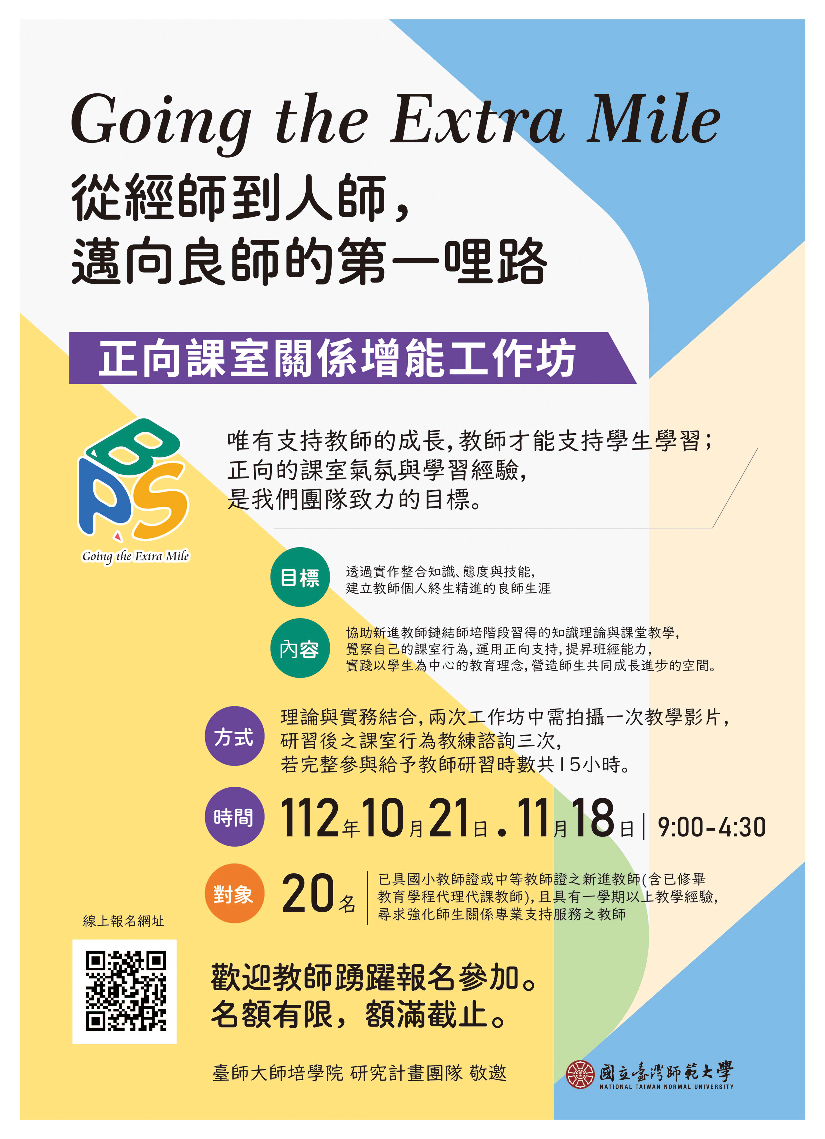 1、第1場次:112年10月21日(星期六)上午9時至下午4 時30分,主題:「教師為何要建立正向班級?-正向班級的要素及內涵」,講師:國立臺灣師範大學特殊 教育學系洪儷瑜教授、謝佳真老師、姚惠馨老師。