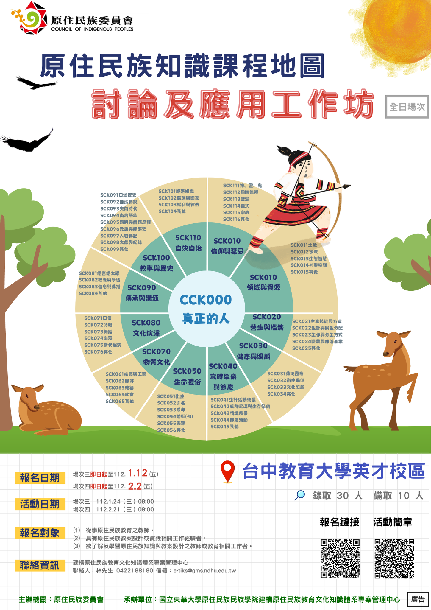 一、活動辦理導入原住民族知識雲端平台系統應用與操作,藉由資訊科技應用將國小、國中及高中不同學習階段進行原住民族教育文化課程地圖之應用與討論,參與者可以獲得資訊科技導入教育課程製作相關知能,並希望能有效轉化 為實務經驗或研究,以利推動原住民族知識課程發展以及增能教師原住民族知識課程教學能量,鼓勵從事原住民族教育之教師、原住民教案設計實踐工作者,踴躍報名。