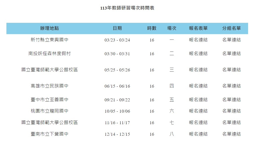 (三)第三場次師大1場:113年5月25日(星期六)至5月26日(星期日);研習地點:國立臺灣師範大學公館校區;報名連接:https://forms.gle/B49MSNDVbgDv67w29。