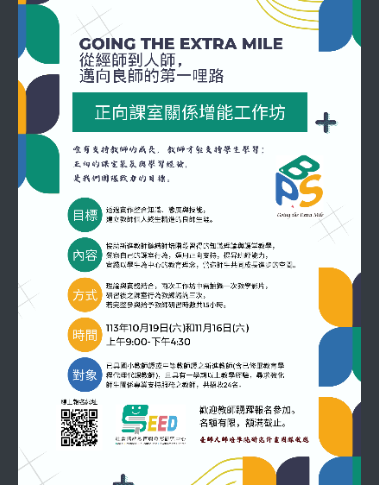 2、第2場次:113年11月16日(星期六)上午9時至下午4 時30分,主題:「教師如何建立正向班級?-因應運作上的挑戰並持續成長」,講師:臺師大特殊教育學系洪儷瑜教授、謝佳真老師、姚惠馨老師、蘇吉禾老 師、林淑瑜老師。