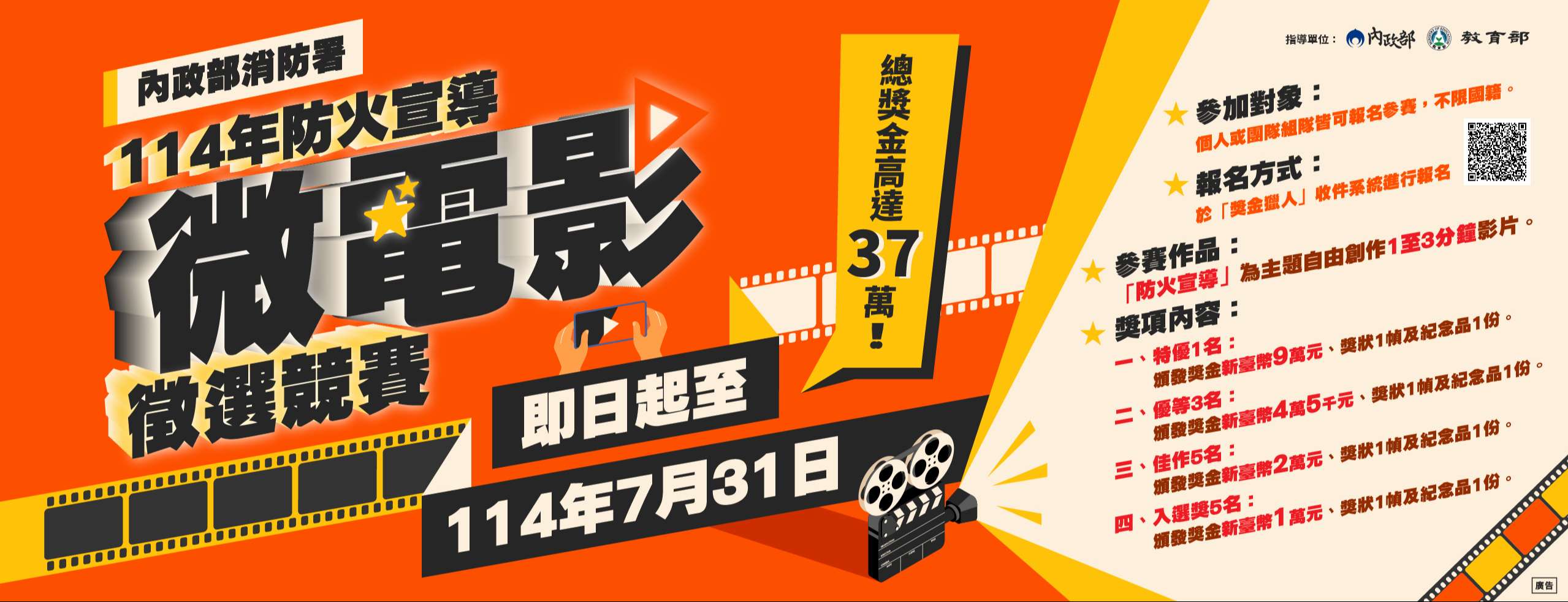 主旨:函轉內政部消防署「114年防火宣導微電影徵選競賽活動辦法」及徵件圖卡,請貴校踴躍參加,請查照。