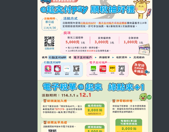 (三)「e起支付Pay 順稅抽好禮」,4月30日前以行動支付、 電子支付或約定轉帳繳納本市開徵使用牌照稅者,即可 參加抽獎。