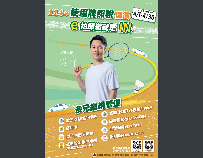 說明: 一、隨函檢附114年使用牌照稅開徵宣導海報及旨揭活動DM電子 檔各1份。