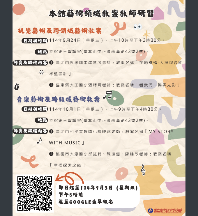 2、請自即日起至114年9月3日(星期三)下午5時前至 GOOGLE表單報名,國立臺灣藝術教育館將於114年9月5 日(星期五)於官網公告名單,依實際參加課程核予該場次研習時數,請事先上全國教師在職進修資訊網 註冊,以利後續登錄研習時數。