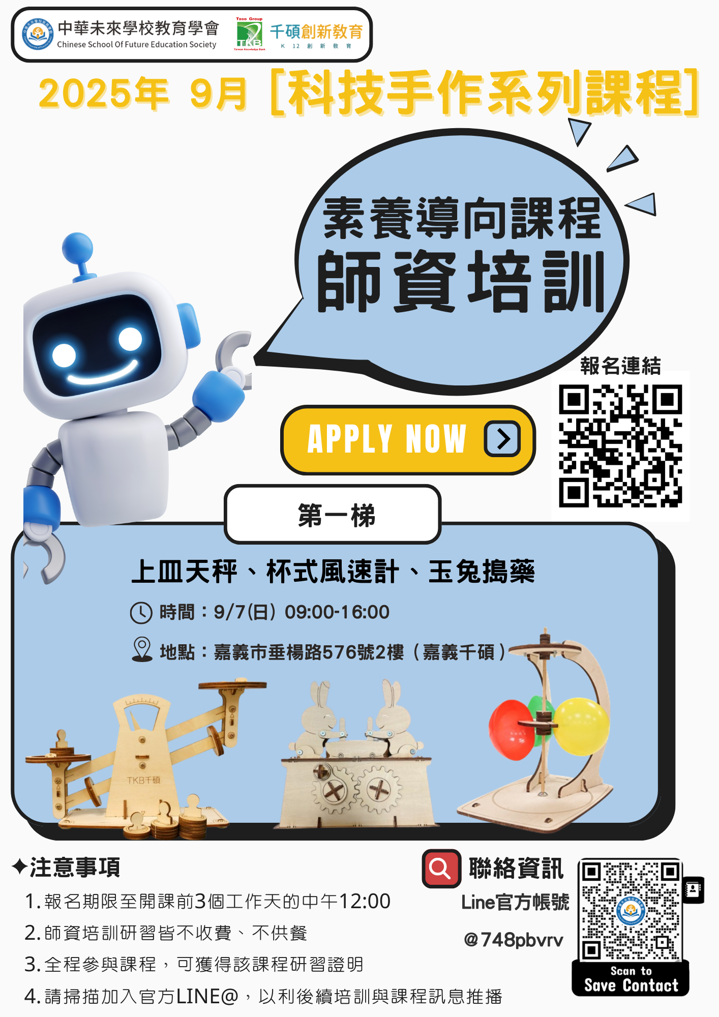 一、為增進教師跨領域專業知能,提升對 STEAM 教育之整合運用能力,並強化教學現場實務應用,本會特辦理「科技手 作師資培訓課程」。