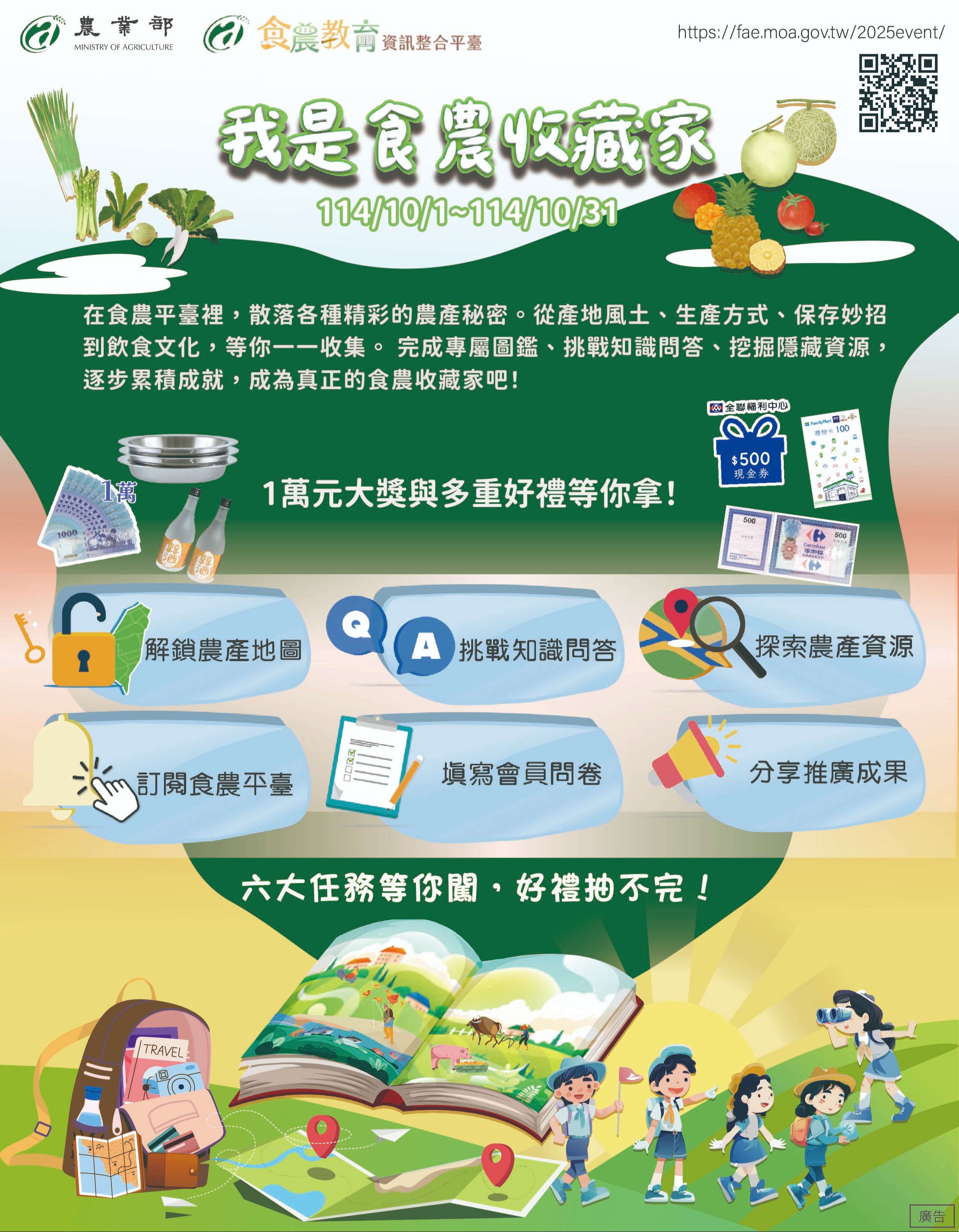 二、為使大眾更加瞭解食農教育並善用網站資訊,該部於食農平臺舉辦「我是食農收藏家」活動(網址:https://fae.moa.gov.tw/2025event/),設計解鎖農產圖鑑、挑戰知識問答、探索農產資源等互動遊戲,凡完成任一項任務者即可參加抽獎,獎品包含萬元現金、廚房用品與禮券等多項好禮。